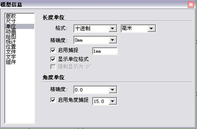 B.系统单位的调整:点击"窗口--模型信息"或点击标准工具栏的 按钮出现对话框,选择"单位",调整结果如图